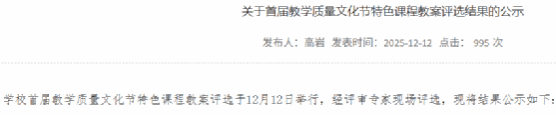 近日,学校质量管理与评价处公布了《关于首届教学质量文化节特色课程教案评选结果的公示》,色情直播