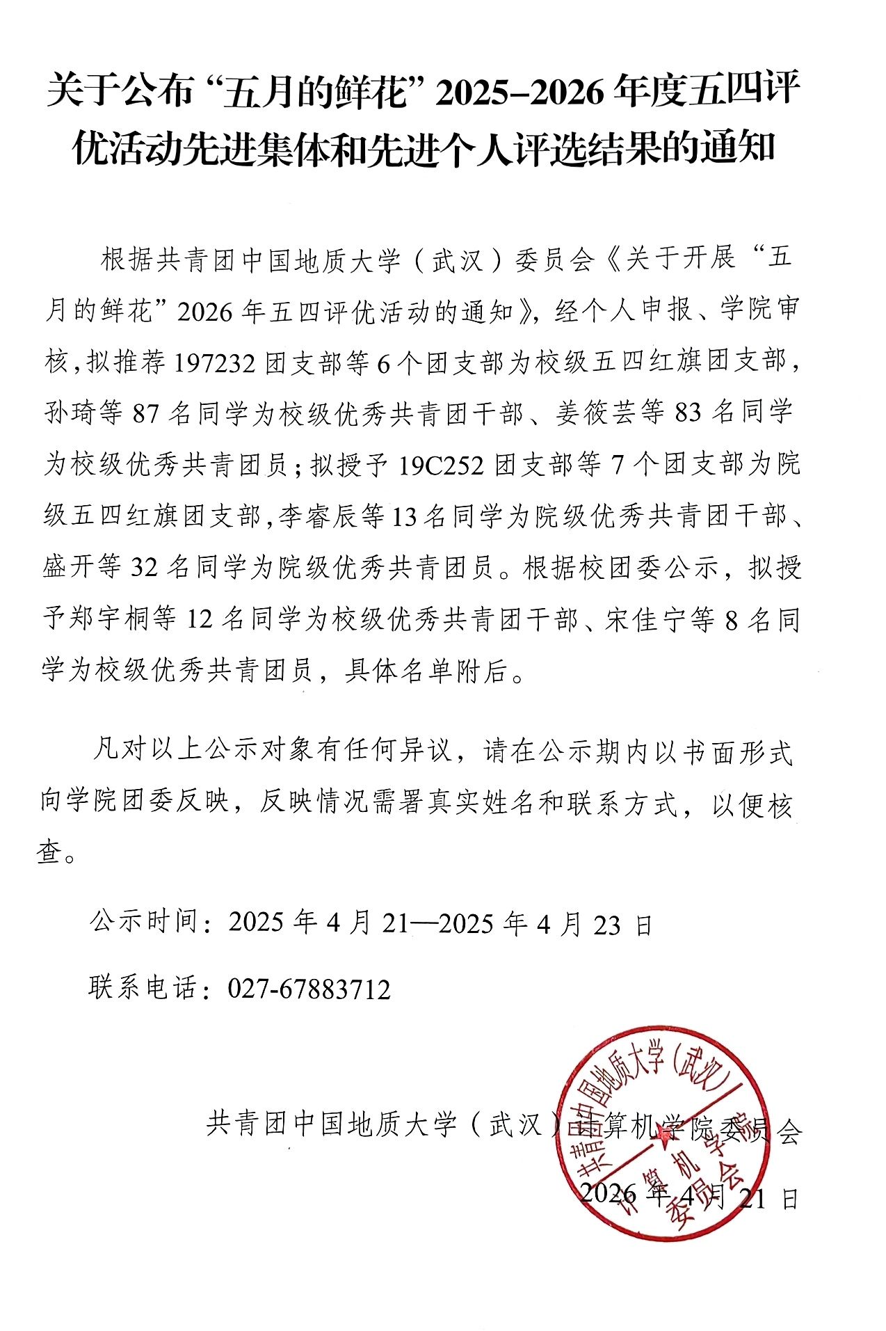 关于公布“五月的鲜花”2025-2026年度五四评优活动先进集体和先进个人评选结果的通知